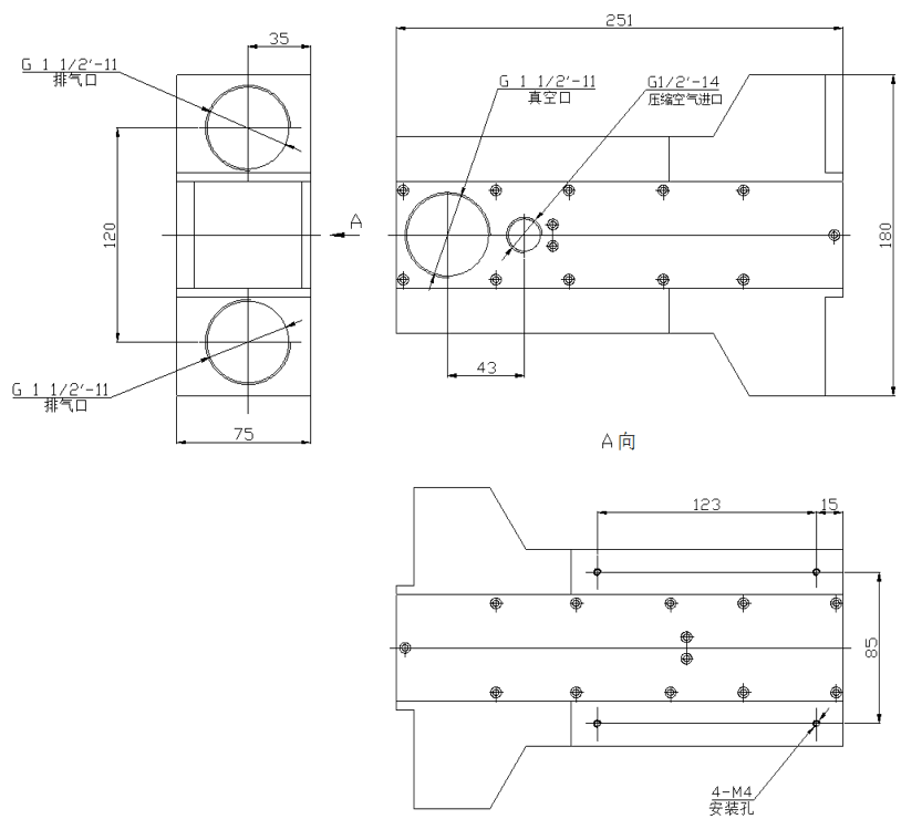 3. XFH-60多級(jí)真空發(fā)生器的排氣口在其底部,安裝時(shí),應(yīng)保證真空發(fā)生器底部留有50mm的排氣空間,或用內(nèi)徑不小于?30的排氣管接出。